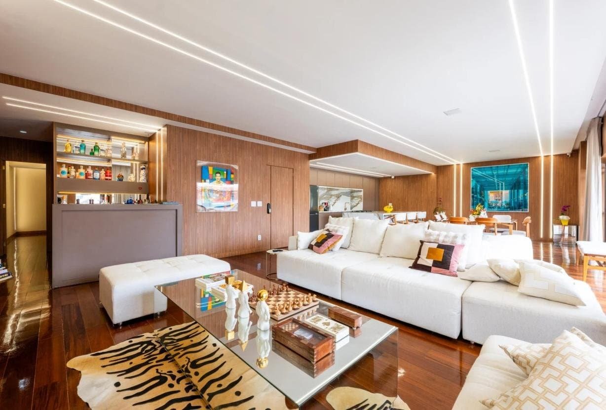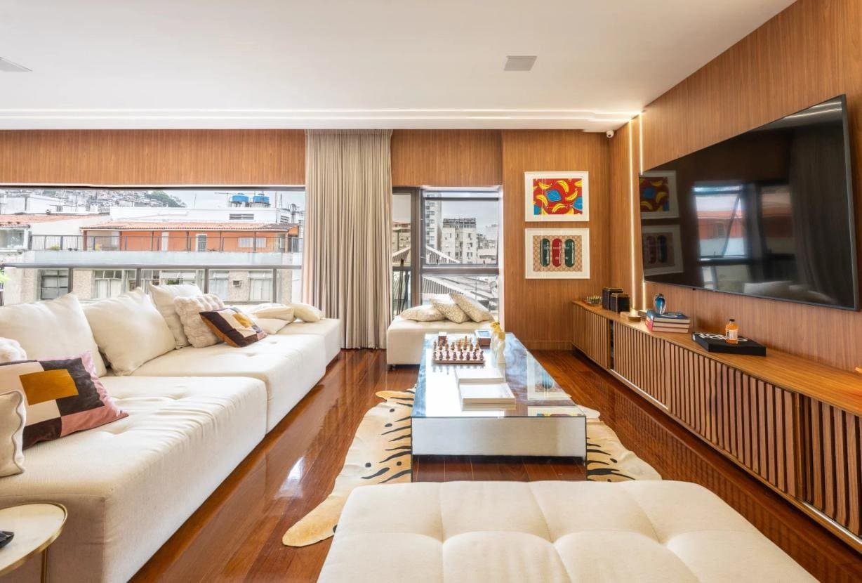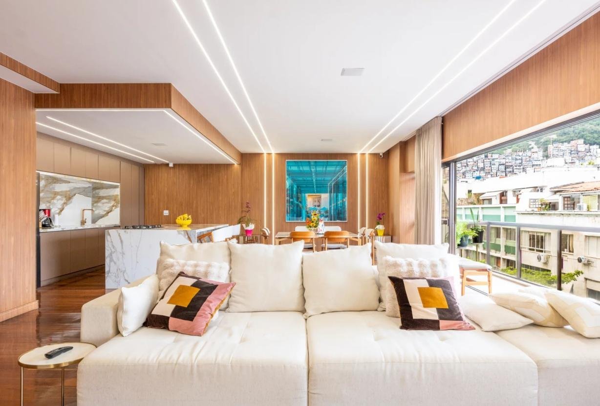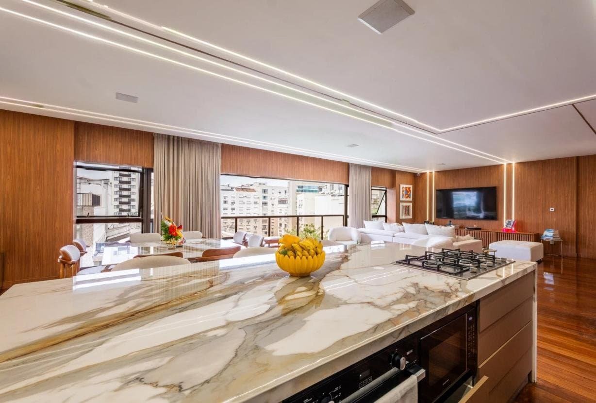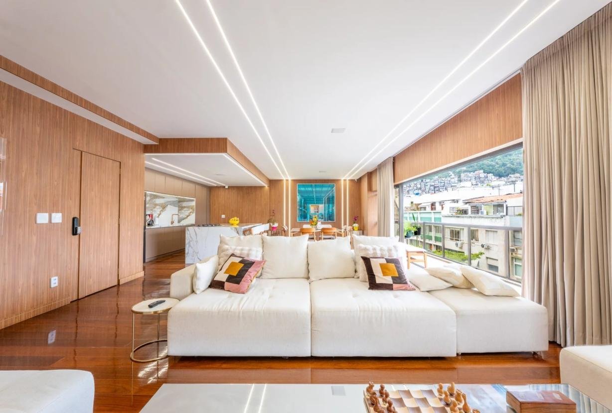 Completamente remodelado em 2024, o imóvel impressiona pelas linhas limpas, pela luminosidade abundante e por uma organização espacial impecável. O grande destaque é a magnífica sala de estar de 90 m² orientada para sudoeste, inundada de luz natural e conectada a uma ampla varanda com vista totalmente aberta — um cenário privilegiado para contemplar o pôr do sol do Rio em absoluta paz.