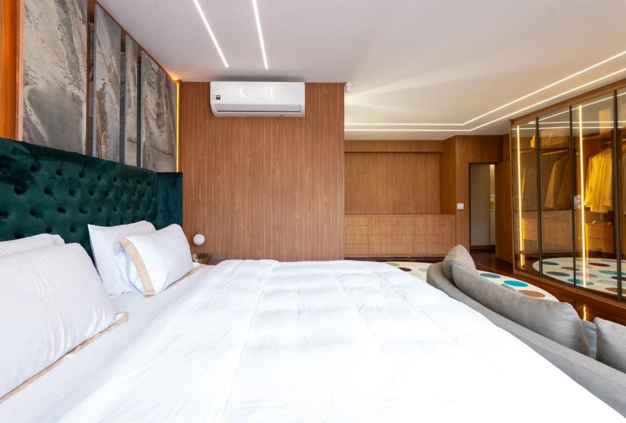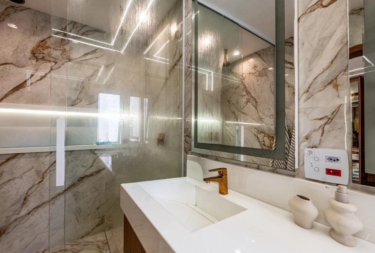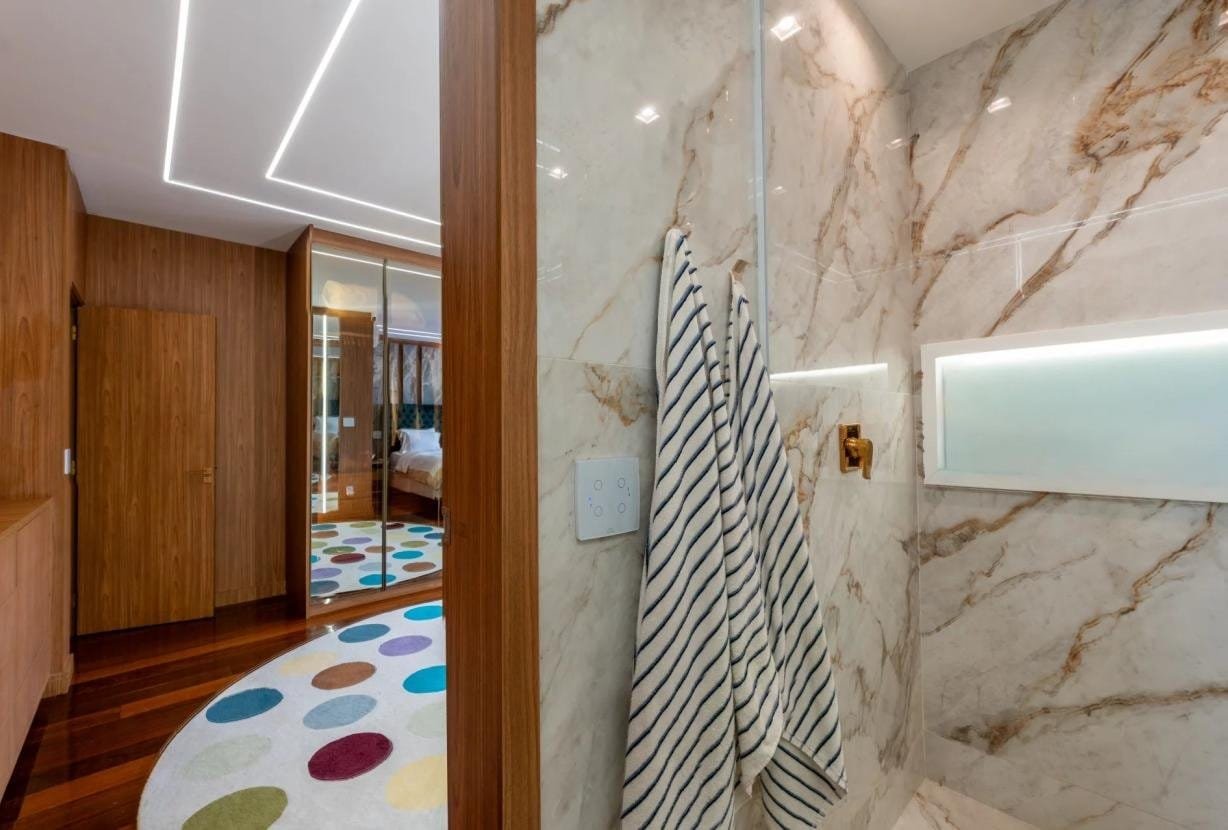 Os três quartos, todos com casa de banho privativa, garantem privacidade e conforto máximo. A suite principal é especialmente notável, com dimensão generosa, um belíssimo closet e acabamentos de alto padrão.