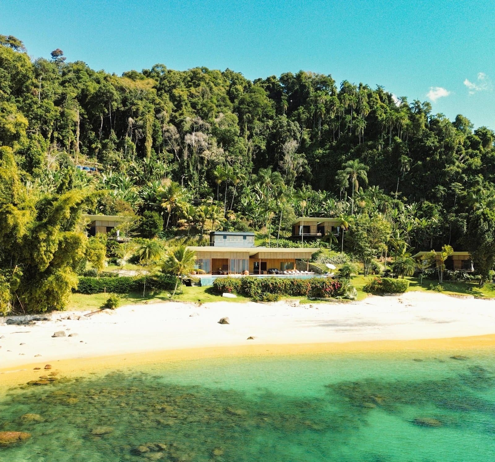 Entre a mata nativa e o mar aberto, esta propriedade revela um refúgio raro, onde sete suítes distribuídas em bangalôs independentes se integram perfeitamente ao ambiente natural. A casa principal recebe com amplitude e luz, enquanto a sala de estar enquadra o horizonte azul, criando uma atmosfera contemplativa que harmoniza exclusividade e serenidade.